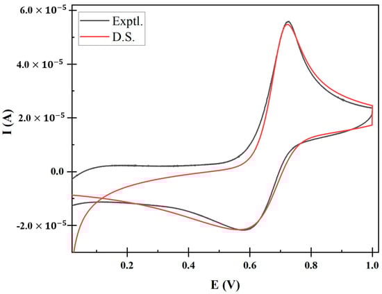 The best fit of the simulated voltammogram at 0.300 V/s is presented in Figure 6. The best fit of CV was achieved using the following parameters: E1/2 = 0.645 V; α = 0.28; D0 = 2.45 × 10−5 cm2/s; k0 0.017 cm/s; Kf = 9 × 10−6 M−1s−1 and Kb = 850 M−1s−1. The reproduction of a fitted cyclic voltammogram using these parameters validates the accuracy of the methodologies used in this study.