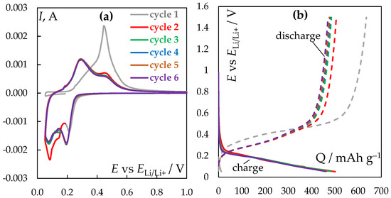Cyclic voltammetry (a) and charge–discharge dependencies (b) characterizing the behavior of the silicon fiber-based anode during the initial 6 lithiation/delithiation cycles.