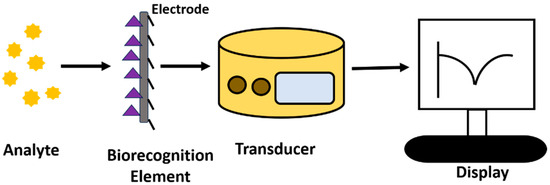 Accounts for the basic format of an electrochemical biosensor. The biorecognition element in the presence of the specific analyte leads to the unique property of a biological recognition event on the transducing device. The bioreceptor signals are converted into a suitable output that is easily readable by the display setup.