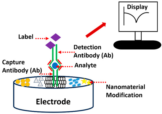 Accounts for the fabrication of an electrochemical immunosensor. The constituents of the electrode fabrication account for suitable nanomaterial modification, followed by the capture antibody, analyte, or the protein of interest, the labelled detection antibody that gives the signal only after the ELISA process is complete.