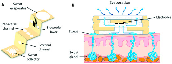 Schematic illustration of a sweat-based electrochemical microfluidic integrated device, which allows the sweat to pass through different filters to ensure the removal of inactive systems and interfering systems that might add complications to the analysis (A). While (B) corresponds to the attachment of the sensor on the body part and cross-sectional illustration for the sweat glands that secrete sweat, which passes through a channel into the electrode and finally gets evaporated after analysis. Copyright, RSC Advances, 2019 [43].