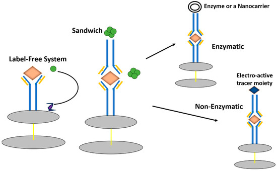 Different examples of amperometric immunosensors. There are various types, such as label-free-, sandwich-, enzymatic-, and non-enzymatic-based sensors. Based on varied properties of the protein of interest, they are aptly fabricated for defined signal output.