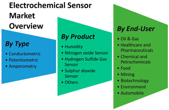 The electrochemical instrument market has segmented a compound annual growth rate expanding ~4%, with the domains of products, end users, and region. The projected market is supposed to increase to a valuation of ~USD 3 billion by 2026 [76]. This enlargement is majorly due to rising consumer demand for multi-parameter testing and the need for safe drinking water and environment across regions. The key companies are Dkk-Toa Corporation, Yokogawa Electric Corporation, India; Horiba Ltd., Kyoto, Japan; Hanna Instruments Inc., Italy; Mettler-Toledo International Inc., Danaher Corporation, USA; Xylem Inc., USA; Metrohm AG, Swizerland; Endress+ Hauser AG, Germany, which are the major leading electrochemical profiles. It is anticipated that a wide number of biotechnological and pharmaceutical firms will be the driving factor for the electrochemical advancement, which has led to an increment in the development of spending in the power and energy sector. Battery systems are another significant element anticipated to foster market upliftment. The prevalence of illness brought about by air pollution has the demand for environmental monitoring due to the rise in legislation and awareness campaigns, thereby increasing the spending efficiency for electrochemical-based devices market prototypes. Figure 6 encompasses an electrochemical sensor market overview for the case of the user, product, and end-user profile. For prognosis during the COVID-19 pandemic, prototypes have been built for the monitoring of antibody and antigen levels, with commercially available examples being BinaxNOW, a test developed by Abbot, and the InteliSwab, developed by OvaSURE [77,78,79]. However, due to their low sensitivity and high false negative drawbacks, electrochemical detection techniques can be used to overcome these. Proper avenue development for accurate POC technology requires several stages of development, with the integration of reagent delivery and sample collection, in addition to the diagnostic test and end user comfort. A screen-printed system has been developed for the detection of nucleocapsid protein to quantify severe acute respiratory syndrome-coronavirus-2 (SARS-CoV-2) involving chronoamperometry [80]. The developed biosensor was studied with cross-reactivity interferences to ensure the selectivity of the system, followed by a proof-of-concept study. Later, a similar study was performed using a smartphone-based inexpensive serological diagnosis of SARS-CoV-2 using a ferro-ferricyanide-modified electrode with a square wave voltammetry approach [81]. Figure 7 illustrates the smartphone-based prototype for the same.