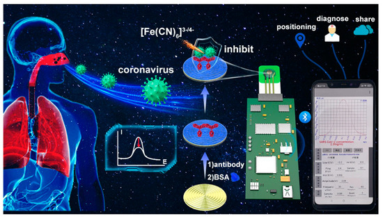 Illustration of smartphone-enabled point-of-care electro-immunosensor SARS-CoV-2 N protein detection prototype. Copyright and preprinted Anal. Chem. 2022 [81].