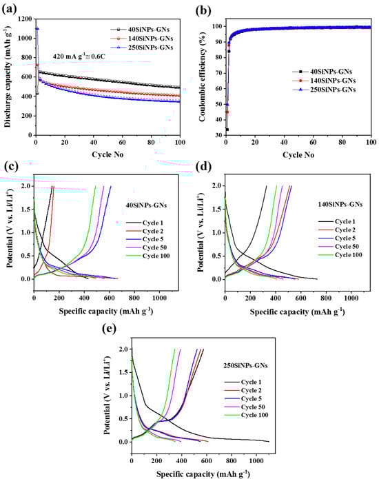 Electrochemical performances of SiNPs-GNs composite with various sizes of Si nanoparticles: (a) cycling stability at a current rate of 420 mA g−1 (1C = 755 mA g−1); (b) Coulombic efficiency; (c–e) corresponding galvanostatic discharge/charge profiles for the selected cycles.