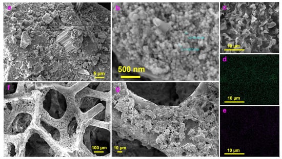 The microstructure and surface morphology of the 2D NSN was examined using FESEM imaging and Figure 1a–c represent the FESEM images of the 2D NSN at three different magnifications. From these images, it can be observed that the 2D NSN exhibits a flake-like fluffy structure, as discussed in our earlier work []. The EDX elemental mapping images to show the distribution of nickel and sulfur in the 2D NSN are shown in Figure 1d,e, respectively. This confirms the presence of nickel and sulfur in the 2D NSN. The FESEM images of the 2D NSN/PEDOT:PSS (NPS1) nanocomposite SC electrode are shown in Figure 1f,g. This particular nanocomposite combination, NPS1, exhibits a superior electrochemical performance when used as an SC electrode, which will be discussed at a later stage. The 2D NSN mixed with PEDOT:PSS coated over nickel foam shows an open porous network structure, which is highly beneficial in attaining good electrochemical performance when used as electrode-active materials in SCs.
