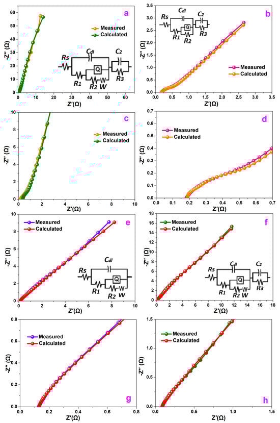 The electrochemical performance characteristics of the PEDOT:PSS-modified 2D NSN electrodes was evaluated in a three-electrode cell configuration in 2 M KOH (aqueous) electrolyte. The EIS analysis represented in the form of a Nyquist plot obtained for the pristine PEDOT:PSS SC electrode is shown in Figure 2a,c and those for the 2D NSN/PEDOT:PSS nanocomposite SC electrodes are shown in Figure 2b,d–h. A Nyquist plot is the representation of the real and imaginary parts of impedance within a specified frequency range. The Nyquist plot of the PEDOT:PSS SC and 2D NSN/PEDOT:PSS nanocomposite SC electrodes contains three regions: the high-frequency region contains a semi-circle, the high-medium frequency region contains a straight line with a slope of ~45°, and the low-frequency contains a vertical line parallel to the Y-axis.