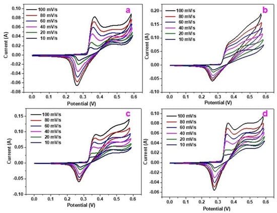 From the EIS analysis, it is clear that NPS1 exhibits a lowest series resistance when compared with the other SC electrodes. To evaluate the charge storage exhibited by the SC electrodes, CV analysis was performed within a potential window of 0–0.6 V at different scan rates and the results are shown in Figure 3a–d. The CV curves of the pristine PEDOT:PSS SC electrode (Figure 3a) and the NSN/PEDOT:PSS nanocomposite SC electrodes (Figure 3b–d) exhibit a pseudocapacitive charge storage that arises from the redox reactions. The CV profiles consist of oxidation and reduction peaks, representing an anodic peak with positive current density and a cathodic peak with negative current density. The appearance of redox peak pairs in the CV curves of the 2D NSN/PEDOT:PSS nanocomposite SC electrodes shows that the charge storage is mainly by means of redox reactions. The cathodic peak in the CV curve is introduced by the K+-ion insertion into the 2D layered NiS2 architecture, modified with PEDOT:PSS. A high symmetry to the CV curves shows an excellent electrochemical stability held by the SC electrodes.