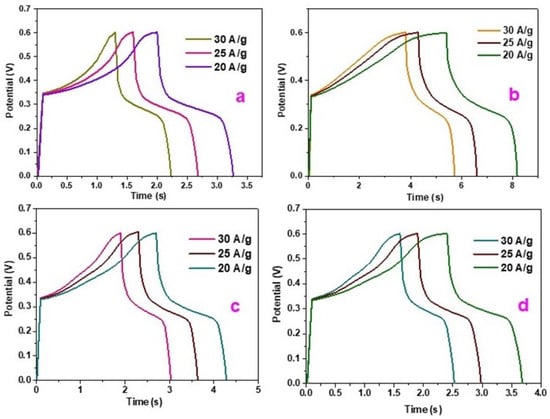 With respect to an increase in scan rate, there exists an increase in redox current, which tends to produce anodic peak shift towards a positive potential and cathodic peak towards a negative potential. Even at higher scan rates, the shape of the CV curves possesses no significant variation, which shows the excellent electrochemical reversibility and rate performance of the SC electrode. The area under a CV curve of the 2D NSN/PEDOT:PSS nanocomposite SC electrodes indicates their charge storage performance and a CV curve with a higher area under the curve exhibits superior performance. Among the various 2D NSN/PEDOT:PSS nanocomposite SC electrodes, NPS1 exhibits a higher area under the CV curve, which exhibits a superior charge storage performance when compared to the others. A mass specific capacity of 462.57 C/g is obtained at a scan rate of 10 mV/s for the NPS1 nanocomposite SC electrode. The synergistic interaction between NiS2 and PEDOT:PSS introduced an efficient battery-type SC electrode character to NPS1 nanocomposite SC electrode. The GCD analyses of the pristine PEDOT:PSS SC electrode and the NSN/PEDOT:PSS nanocomposite SC electrodes are given in Figure 4a–d. From the GCD curves, it can be observed that the initial and final portions correspond to an EDLC behavior.