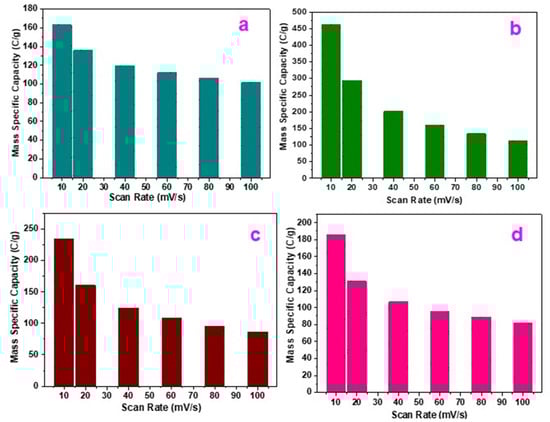 Plot of variation in the mass specific capacity at different scan rates for (a) pristine PEDOT:PSS SC electrode and (b) NPS1, (c) NPS2, (d) NPS3 nanocomposite SC electrodes.