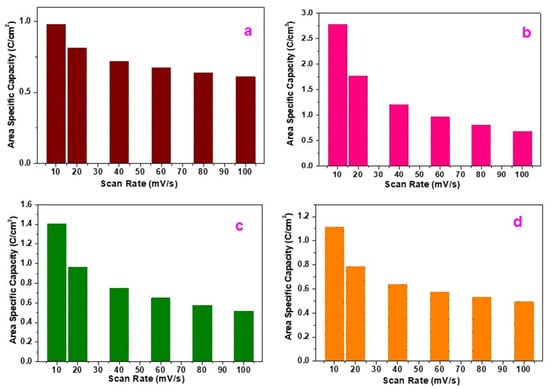 The solvated ions intercalation and faradaic reaction in the final portion correspond to a battery-type charge storage behavior. Thus, the proposed PEDOT:PSS-modified NiS2 electrodes are said to exhibit a battery-type character, which is confirmed using Dunn’s kinetic method and will be discussed later. At higher current densities, the charge-discharge performance of the NSN/PEDOT:PSS nanocomposite SC electrodes is found to be diminished. The plots showing the variation in the mass specific capacity with respect to scan rate for the pristine PEDOT:PSS SC electrode and the NSN/PEDOT:PSS nanocomposite SC electrodes are depicted in Figure 5a–d. The pristine PEDOT:PSS SC electrode delivers a mass specific capacity of 162.87 C/g at a scan rate of 10 mV/s. The NSN/PEDOT:PSS nanocomposite SC electrodes, such as NPS1, NPS2, and NPS3, exhibit a mass specific capacity of 462.57 C/g, 234.4 C/g, and 185.54 C/g, respectively, at a scan rate of 10 mV/s. The area specific capacities of the pristine PEDOT:PSS SC electrode and the NSN/PEDOT:PSS nanocomposite SC electrodes are given in Figure 6a–d. The NPS1 SC electrode also exhibits an area specific capacity of 2.77 C/cm2 at 10 mV/s, which reveals the efficiency of this optimized electrode for further studies.