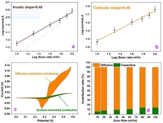 (a) Plot of log scan rate v/s log peak current for the anodic peaks of NPS1 nanocomposite SC electrode; (b) plot of log scan rate v/s log peak current for the cathodic peaks of NPS1; (c) CV curve obtained at a constant scan rate of 40 mV/s depicting the charge storage contributions from both diffusion-controlled and surface-controlled reactions; (d) Histogram showing the contributions to total charge storage at different scan rates.