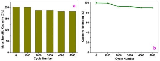 The anodic and cathodic peak processes deduced from the CV analysis for the NPS1 nanocomposite SC electrode are given by a graphical representation of and , as shown in Figure 7a,b, respectively. A mean value of cathodic and anodic peak ‘b’ is about 0.47, which relates to the diffusion-controlled character of NPS1 SC electrode; thus, this electrode is proven to be a battery type. The CV curves of the NPS1 nanocomposite SC electrode displayed in Figure 7c exhibit a capacitive (surface-controlled) contribution (shaded with green), which is about 9.28% of overall specific capacity determined at a scan rate of 40 mV/s, but the contribution introduced from the diffusion-controlled process (shaded with orange) is about 90.72%. The battery-type (diffusion-controlled) total charges stored by the NPS1 nanocomposite SC electrode at various scan rates of 100 mV/s, 80 mV/s, 60 mV/s, 40 mV/s, 20 mV/s, and 10 mV/s are 85.88%, 86.21%, 89.23%, 90.72%, 92.14%, and 94.42%, respectively (Figure 7d). A higher diffusion-controlled phenomenon in the NPS1 SC electrode makes it an efficient battery-type material. The cycling stability of the NPS1 nanocomposite SC electrode was examined in 2 M KOH (aqueous) electrolyte at a constant scan rate of 40 mV/s for 5000 cycles. The variation in the mass specific capacity at different cycle numbers is shown in Figure 8a. A capacity retention of 90.11% is obtained even after completing 5000 cycles (Figure 8b).