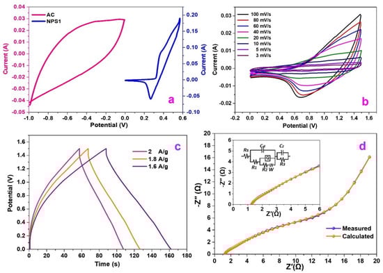 (a) CV curves obtained at a constant scan rate of 100 mV/s showing the different operating potential windows for AC and NPS1 electrodes; (b) CV curves obtained at different scan rates within a potential window of 0 to 1.5 V; (c) GCD curves of battery-type HSC cell obtained at different current densities; (d) Nyquist plot obtained for the battery-type HSC cell (Inset: Nyquist plot obtained in high-frequency region).