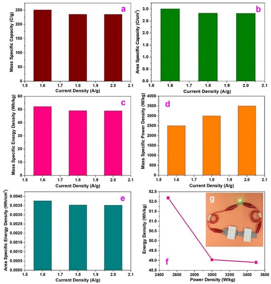 Electrochemical performance evaluation and device testing of the battery-type NPS1//AC HSC cell and module in 2 M KOH (aqueous) electrolyte. (a) Plot of variation in mass specific capacity (in C/g) with respect to current density; (b) Plot of variation in area specific capacity (C/cm2) with respect to current density; (c) Plot of variation in mass specific energy density (in Wh/kg) with respect to current density; (d) Plot of variation in mass specific power density (W/kg) with respect to current density; (e) Plot of area specific energy density (in Wh/cm2) with respect to current density; (f) Ragone plot for battery-type NPS1//AC HSC cell; (g) A battery-type NPS1//AC HSC module comprising of two similar battery-type NPS1//AC HSC cell prototypes connected in series lighting up a green LED immediately after charging it to 3 V.