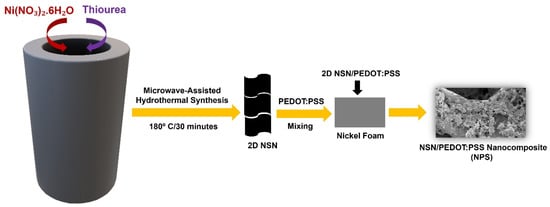 The microwave-assisted hydrothermal method of synthesizing 2D NSNs was adopted to prepare 2D NSN/PEDOT:PSS nanocomposite SC electrodes in accordance with our earlier published work []. The battery-type SC electrodes were prepared by coating the material over nickel foam substrate to promote the electronic conductivity. An amount of 1 mg/mL PEDOT:PSS solution was dispersed in 3 mg of 2D NSN in order to prepare the SC electrode and sonicated to achieve a well-defined suspension. The electrodes for battery-type SCs were prepared by slurry casting over nickel foam and no polymeric or other type of binder was used. The as-prepared electrode is labelled as NPS1. The geometrical area of the SC electrode was fixed to 1 cm2. The mass of electrode-active material was fixed to 3 mg in a SC electrode. The same procedure was repeated by changing PEDOT:PSS to 3 mg/mL and 5 mg/mL which were labelled as NPS2 and NPS3, respectively. All the nanocomposite samples were dried in an oven kept at 60 °C overnight. A schematic diagram representing the synthesis of 2D NSN/PEDOT:PSS nanocomposite is provided in Scheme 1.