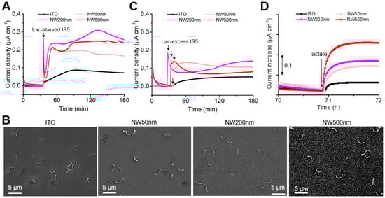 To test this hypothesis, we examined the EET enhancement effect on IS5 with low OMC expression levels. The current production by low-OMC-expressing IS5, obtained by precultivating with excess lactate [21], is shown in Figure 2C. The low-OMC-expressing IS5 did not cause a sharp increase in current after the initial spike, supporting our hypothesis that the steep current increase observed in lactate-starved IS5 was due to an accelerated direct EET process via strengthened electrochemical interactions between OMCs and NW arrays. Additionally, these cells displayed a slower and lower current rise on the flat ITO electrode compared to the OMCs-expressing IS5, indicating that OMCs are involved in the current production on the ITO electrode.
