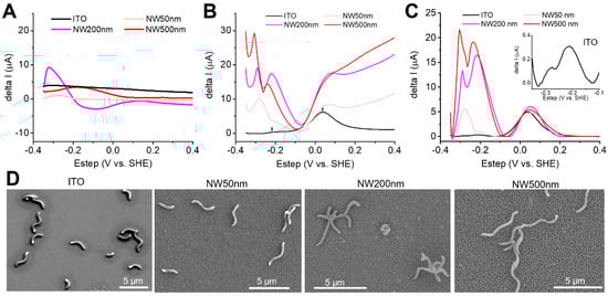 To obtain direct evidence for strengthened electrochemical interactions between OMCs and NW arrays, we conducted the DP voltammetry of OMC-expressing IS5 at 180 min of current measurement (Figure 2A). At this point, the currents had maximized and stabilized, indicating that the OMCs had established a stable electrochemical interaction with the NW arrays. While the DP voltammograms of the sterile electrolyte lacked distinct peaks except for minor fluctuations in background currents on both the flat and NW electrodes (Figure 3A), the DP voltammogram of IS5 cells on the flat ITO revealed two broad peaks in the region of 0.2 to −0.1 V (peaked at 0.05 V) and −0.1 to −0.3 V (peaked at −0.22 V), respectively (Figure 3B). This voltammogram was almost identical to that in a previous study [9], which assigned each peak to self-secreted electron mediators and OMCs, respectively, based on their increased intensities over time and sensitivity to a heme-binding chemical, nitric oxide. In contrast, the DP voltammograms of IS5 on NW arrayed electrodes demonstrated a distinct “U”-shaped background, typically observed with high aspect ratio vertical nanostructured electrodes [26,27,28]. After subtracting the baseline, further details in the OMC peak and the significant amplification of this redox signal by NW arrays were clearly demonstrated (Figure 3C). In comparison to the small OMC peak on the flat ITO electrode, which showed a slight peak separation (Figure 3C inset), likely reflecting the multiple redox centers of the OMC complex [21], both the peak intensity and the peak separation were significantly amplified on NW electrodes. As the cell number on electrodes at the time of DP voltammetry remained comparable for all electrodes (Figure 3D), the enhanced OMCs redox signals on NW arrays indicate strengthened electrochemical interactions between OMCs and the electrodes. Baseline-subtracted DP voltammograms further revealed that the peak intensities of redox mediators remained almost unchanged across all electrodes, indicating that NW arrays did not enhance the mediated electron transfer process, consistent with the conclusion obtained by cyclic voltammetry of the ferric cyanide solution (Figure 1F).