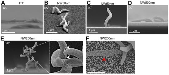 NWs with lengths varying from 50 nm, 200 nm, and 500 nm were fabricated on the Si surface following a previous report [19], and were then sputter-coated with a layer of 20 nm thick ITO to ensure good electrical conductivity (Figure 1A–D). In addition, we prepared the electrode without NWs, sputter-coating ITO on a flat Si surface, is referred to as the ITO electrode. SEM observation of the electrode surface revealed densely distributed NWs arrays. While some remined individual with diameters less than 30 nm, other NWs conjugated into nanowalls with narrow widths of less than 50 nm, similar to the observations made in the previous report [19]. These NW arrays were spaced several tens of nanometers apart, with the density decreasing slightly as NW lengths increased due to more Si being removed during the longer etching period. We found that the NW arrays improved the electrode’s hydrophilicity as water contact angle decreased (Figure 1E), a trend that aligns with previous observations [23] and may promote cell attachment and EET in some bacteria [24,25].