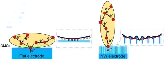 While flat electrode surface materials have facilitated the analysis of the EET mechanisms in SRB, the insoluble substances available in natural environments, which may be reduced by SRB or conduct electrons to them, possess complex nanostructures [32,33,34,35], contrasting starkly to the flat electrodes. However, how nanostructures impact the EET performance of SRB remains unknown. The EET kinetics of IS5 depend on multiple factors, including lactate availability, OMCs expression levels, cell aggregate formation, and the secretion of redox mediators. Nonetheless, by focusing on the EET performance shortly after cell addition, we were able to evaluate the effect of electrode nanostructures while keeping these factors consistent across all reactors. Our results revealed that electrode nanostructures significantly enhanced the direct EET process via OMCs immediately after cell addition, even though the cell contact area with electrodes seemed to decrease as many cells attached vertically to the NW arrays. Although the cell number and the number of OMCs per cell remain the same for the flat and NW arrayed electrodes, NW arrays detected higher redox signals associated with OMCs, indicating significantly stronger electrochemical interactions between OMCs and the electrode, which is key for EET acceleration. We propose that such strengthened interaction is due to the closer positioning of OMCs to the NW arrays, whereas the OMCs of the S-shaped IS5 cells only interact strongly at limited positions on flat electrodes (Figure 5). These results also suggest that SRB may reduce nanowire-structured minerals more rapidly than those with a smooth surface in natural environments.