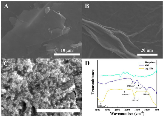 The SEM images (A–C) and FTIR spectra (D) of graphene, GO, and Ag NPs.