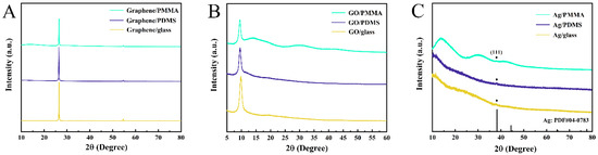 XRD patterns of graphene (A), GO (B), and Ag NP (C) coatings prepared on three different substrate materials.