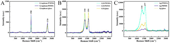 Figure 3C presents the Raman spectra of the Ag NP coatings. The Raman vibration peaks observed at 1340 cm−1 and 1577 cm−1 are characteristic of Ag NPs [19]. Interestingly, the Raman peak intensities of the Ag NP coatings show a specific order: PMMA > glass > PDMS. This observation indicates that PMMA substrate has a potential Raman enhancement effect on Ag NPs [32], and we speculate that this is because plasma etching has a better surface modification effect on PMMA than on PDMS and glass. This observation indicates that the PMMA substrate has a potential Raman enhancement effect on the Ag NPs, likely due to the favorable interactions between the coating and the PMMA surface.