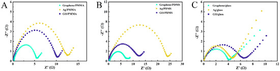 EIS of graphene, GO, and Ag NP coatings prepared on PMMA (A), PDMS, (B) and glass (C).