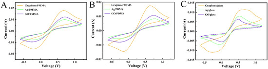 CV of graphene, GO, and Ag NP coatings prepared on PMMA (A), PDMS, (B) and glass (C).