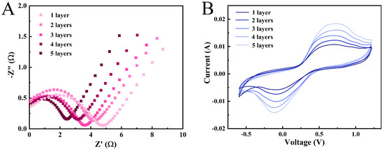 EIS (A) and CV (B) of graphene/PMMA with different film thicknesses.