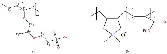 The research objects were experimental homogeneous membranes with a thin selective layer composed of a copolymer of DADMAC and EMA on the surface of a polyfluorosulfonic acid (PFSA) membrane substrate. The chemical structures of the membrane substrate and modifying layer are presented in Figure 1.