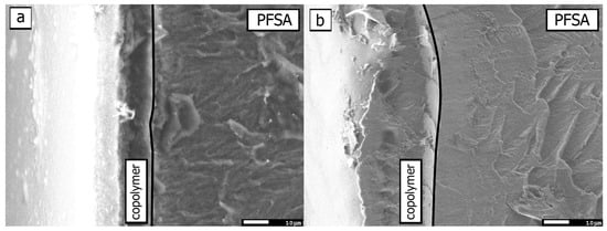 The bilayer membranes were prepared using the following procedure: A layer of PFSA solution, sufficient for forming a 210 µm substrate membrane, was applied to a pre-cleaned and degreased glass surface. Solvent evaporation was carried out at 25 °C and ambient pressure. Once the substrate membrane was formed, a copolymer solution was applied to its surface. Because both layers of the bilayer membrane were prepared from solutions with the same solvent, we propose that applying the copolymer solution to the substrate membrane leads to partial dissolution of the PFSA membrane’s upper layer. This results in at least partial entanglement of the copolymer and PFSA polymer chains. Solvent evaporation then took place at 25 °C and ambient pressure for 24 h. This process produced a dense layer of the copolymer on the cation-exchange membrane surface. Modified membranes with selective layer thicknesses of 6 µm and 24 µm were subsequently designated as MK-1 and MK-2, respectively.