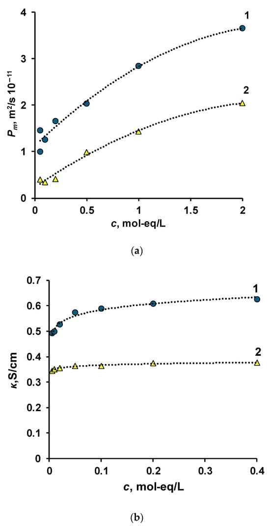 Integral diffusion permeability coefficient of the MA-1 (a) and specific electrical conductivity of the PFSA (b) as a function of electrolyte concentration: 1—NaCl; 2—CaCl2.