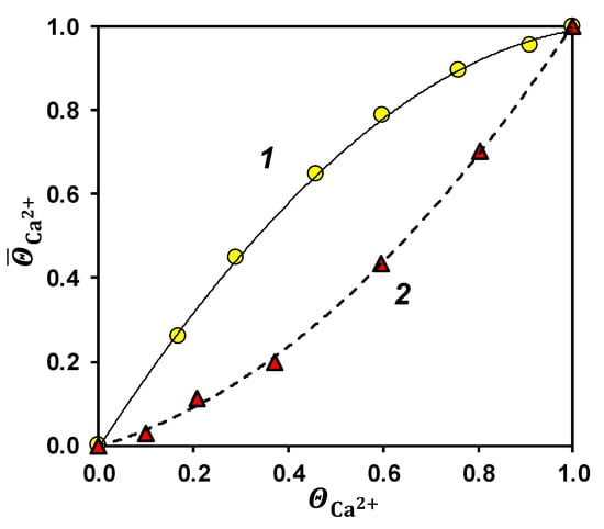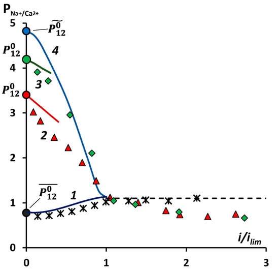A coefficient value greater than unity indicates that the membrane preferentially allows ion type 1 to pass through, resulting in a higher flux of this ion compared to ion 2. Conversely, a value less than unity signifies a greater flux of ion 2. Researchers are typically interested in the specific permeability of membranes for monovalent ions. Therefore, in the provided Equation (4), we will replace index 1 with Na+ ions and index 2 with Ca2+. Note that these designations are opposite to those adopted in our previous article [], where index 1 represented divalent ions.