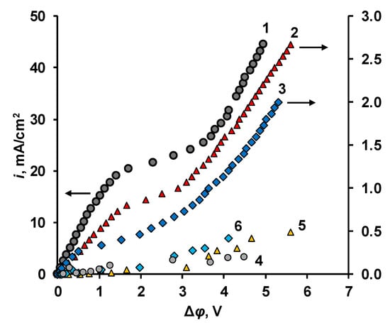 Figure 6 shows that applying an anion-exchange layer with a thickness of 6 μm (MK-1) to the homogeneous PFSA cation-exchange membrane reduces the limiting current density from 21 mA/cm2 to 0.80 mA/cm2. Increasing the anion-exchange layer thickness to 24 μm (MK-2) further decreases the limiting current density to 0.55 mA/cm2. This dependence of the current–voltage characteristics suggests the formation of an internal diffusion-limited current at the modifying layer/substrate membrane interface [].
