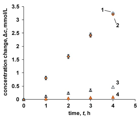 Increase in the concentration of individual ions in the cathode chamber of the rotating membrane disk as a function of time. 1 and 3—concentration increase for sodium and calcium ions using the PFSA membrane, 2 and 4—concentration increase for sodium and calcium ions using the MK-2 membrane.