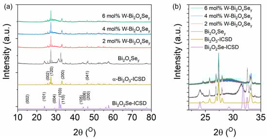 The powder XRD patterns are presented in Figure 1, along with standard data from the Inorganic Crystal Structure Database (ICSD) for comparison. The pristine sample prepared without W-doping showed a composite structure that resembles α-Bi2O3 (ICSD code: 2374) and Bi2O2Se (ICSD code: 2903). Upon W-doping, the peaks from Bi2O2Se seem to disappear and a broad amorphous peak appears (2θ ≈ 22–32°). Ghosh et al. [33] and Chitara et al. [16] have also observed similar broad peaks for amorphous-type as-synthesized Bi2O2Se with short synthesis times. The intensity of the amorphous peak increases with W-doping (Figure 1b). It can be rationalized that tungsten preferably coordinates with Se2- and forms the amorphous W-doped bismuth oxyselenide component. The XRD patterns for all doped samples show a dominant Bi2O3 phase with the absence of any crystalline Bi2O2Se.