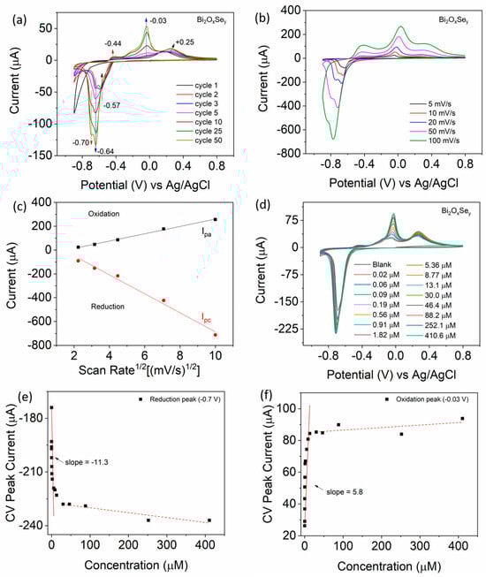 CV analyses for Bi2OxSey: (a) CV in blank electrolyte run for 50 cycles at 10 mV/s. (b) CV in blank electrolyte at different scan rates after stabilization. (c) Plot of CV peak current vs. square root of scan rate. (d) CV with increasing concentration of H2O2, incrementally added post stabilization. (e) Plot of reduction peak current vs. concentration. (f) Plot of oxidation peak current vs. concentration. The black squares represent the peak current, the solid red lines represent the linear fits, and the dotted red lines indicate the non-sensitive regime.