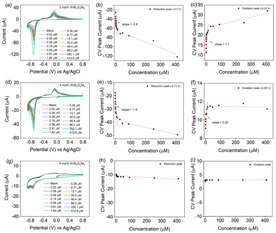The CV scans for the doped samples (after stabilization for 50 cycles) with increasing H2O2 concentrations are plotted in Figure 5. Although multiple redox peaks are observed in undoped Bi2OxSey sample, possibly originating from different chemical environments of Bi-O and Bi-Se, the oxidation peak around +0.3 V and the reduction peak around −0.57 V are completely absent in the doped samples. Most probably, this set of redox peaks probably belongs to the semi-crystalline Bi2O2Se component. The sensitives for both oxidation and reduction peaks are evaluated in the same manner as aforementioned. It is clear from the slope values that the sensitivity towards H2O2 falls upon W-doping. This can be due to the transformation of composite nanosheets to Bi2O3 dominant spherical particles. In our earlier work, we had a similar observation where Bi2O3 nanomaterial showed poor sensitivity than undoped composite Bi2OxSey [34]. It can also be seen from Figure 5g–i that the 6 mol% W-Bi2OxSey is completely insensitive to H2O2. Therefore, no attempt is made to fit the data points.