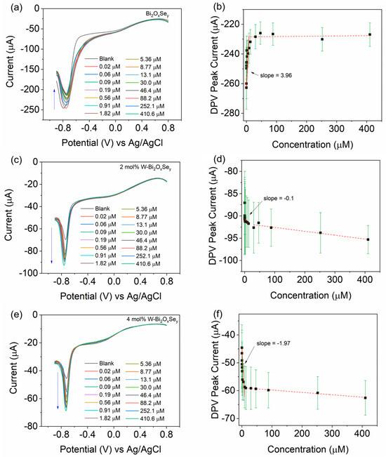 Left panel: DPV scans of (a) undoped, (c) 2, and (e) 4 mol% W-doped Bi2OxSey samples. Right panel: Linear fits of the DPV peak current (at approximately −0.7 V) with respect to H2O2 concentration of (b) undoped, (d) 2, and (f) 4 mol% W-doped Bi2OxSey samples to determine the sensitivity. The black squares represent the average data of three fresh experiments, the solid red lines represent the linear fits, and the standard errors are presented as green color lines. The dotted red lines indicate the non-sensitive regime.
