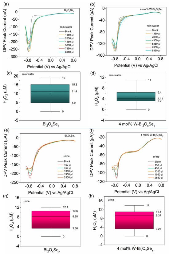 Furthermore, for practical applications of these materials as H2O2 sensors, we tested the fabricated electrodes (undoped and 4 mol% W-doped Bi2OxSey) using rainwater collected during a thunderstorm (hurricane Helene passing over Durham, North Carolina, dated 27 September 2024) and real urine (from a diabetic individual). The DPV technique was used as it is faster (a few seconds) compared to CV (a few minutes). In both cases, we first added 150 µL of the real sample in 15 mL of 1X PBS, followed by 300 µL of sequential addition. Argon gas purging and stirring were maintained during each addition. For the assessment of the rainwater sample, 30 readings were recorded, while we measured 10 readings in the case of urine samples. We only present a few DPV scans for data clarity. The slopes of the calibration curves (Figure 6b,f) were used to estimate the range of H2O2 in both the real samples. In case of both rainwater and urine, the DPV scans (Figure 7a,b,e,f) show an ‘inhibitive’ character for both electrodes. The box charts are presented in Figure 7c,d,g,h.