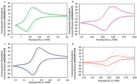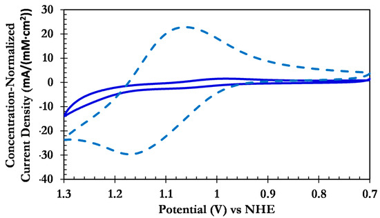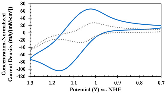Figure 3 shows an overlay of post-equilibration cyclic voltammograms for Nafion-modified and unmodified electrodes in 0.1 M nitric acid while Figure 4 shows overlays of post-equilibration 50 mV/s cyclic voltammograms for Nafion-modified and unmodified electrodes in each electrolyte in acetonitrile. The current for aqueous Nafion-modified electrodes has significantly higher current density than the various nonaqueous conditions tested. The oxidative peak current for a Nafion electrode in aqueous conditions increased to −104 mA/(mM∙cm2) from −26.7 mA/(mM∙cm2) for an unmodified electrode. This observation is consistent with the behavior of Nafion® in aqueous environments outlined in previous studies; Dahms–Ruff apparent diffusion contributes to higher currents than the same concentration of redox molecule without a Nafion film [1,2].