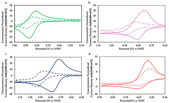 Overlaid 5 mV/s cyclic voltammograms pre-equilibration (solid lines) and post-equilibration (dashed lines) for platinum working electrode modified with Nafion film, platinum mesh counter electrode, Ag/Ag+ quasi-reference electrode calibrated to vs. NHE by Fc/Fc+ redox couple, 1 mM tris(2,2′-bipyridine)ruthenium(II)hexafluorophosphate redox probe, and 0.1 M electrolyte where the electrolyte is (a) TBA triflate, (b) TBABF4, (c) TBAPF6, and (d) NH4 triflate. Data are normalized by redox molecule concentration (which varied between 0.9701 and 1.009 mM) to eliminate effects of concentration on current.
