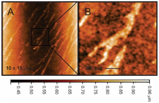 Representative height-mode atomic force microscopy (AFM) images of Nafion–TMS (A) at low and (B) higher resolution. The line fit (color intensity) represents the vertical profile of the sample, where the lightest region corresponds to the highest point.