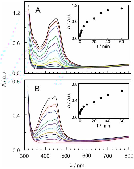 The immobilization of Ru2+ complex into Nafion–TMS membranes was performed via a one-step method (see Experimental Section). To better understand the interactions and mechanisms involved in the immobilization process, we carried out a spectrophotometric study during the incorporation of [Ru(bpy)3]2+ and [Ru(phen)3]2+ complexes into Nafion–TMS polymer over time. Figure 2 shows the UV-vis spectra of [Ru(bpy)3]2+ and [Ru(phen)3]2+ while being incorporated into Nafion–TMS. The study was carried out with Nafion–TMS membranes in contact with a 1 mM Ru2+-complex aqueous solution for a specified time. The UV-vis spectra display a low-energy band positioned at approximately 455 nm which can be attributed to the metal-to-ligand charge transfer (MLCT) transition [31], as confirmed by comparing with the spectra of standard Ru complexes. As observed, the signal continuously increased with longer immersion times, indicating that the complex was being loaded into the film.