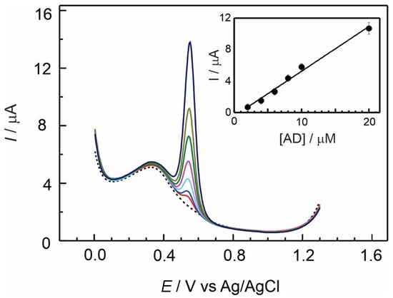 Figure 3 presents a series of differential pulse voltammograms recorded at a Nafion–TMS modified GC electrode at micromolar concentrations of AD in 0.1 M sulfuric acid, within a potential window from 0 to 1.3 V versus the Ag/AgCl reference electrode. A sharp well-defined redox signal was observed at approximately 550 mV, which can be attributed to the redox reaction shown in Reaction 1. The electrode reaction follows a two-electron process, accompanied by the transfer of two protons, and is highly dependent on the solution pH. The inset of Figure 3, presents the current linear response of AD with increasing concentration in the range from 2 to 20 micromolar, yielding a sensitivity of 0.57 ± 0.027 μA/μM. The analytical parameters are reported in Table 1.