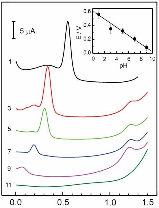 It is widely recognized that electrochemical characteristics of catecholamines are highly dependent on pH. The effect of pH on the electrochemical detection of AD was examined across a range of pH values ranging from 1 to 11. Figure 4 shows differential pulse voltammograms registered for 2 × 10−5 mol L−1 AD at several pH values using a Nafion–TMS-modified GC electrode. The peak potential of adrenaline oxidation presents a linear dependence with pH. A negative shift in the oxidation peak potential occurred with increasing pH, following a Nernstian behavior as evidenced by the slope of the linear correlation shown in the inset of Figure 4. This slope was −56 mV/pH-unit, which is nearly identical to the ideal Nernstian behavior (−59 mV/pH), and similar to the performance registered for dopamine at several pH values [28]. Usually, this phenomenon is due to pure thermodynamic conditions, but it may also indicate that the electron transfer reaction occurs in tandem with proton transfer and depends on proton concentration.