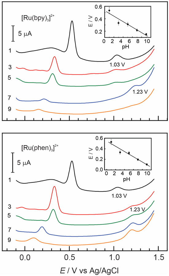 Differential pulse voltammograms recorded at 2 × 10−5 M adrenaline at several pH values ranging from 1 to 9, using Nafion–TMS–[Ru(bpy)3]2+ and Nafion–TMS–[Ru(phen)3]2+-modified GC electrodes. DPV parameters: v = 20 mV s−1; pulse amplitude, 50 mV; pulse period, 200 ms. Insets: Relationship between the anodic peak potential and the pH of the electrolyte.
