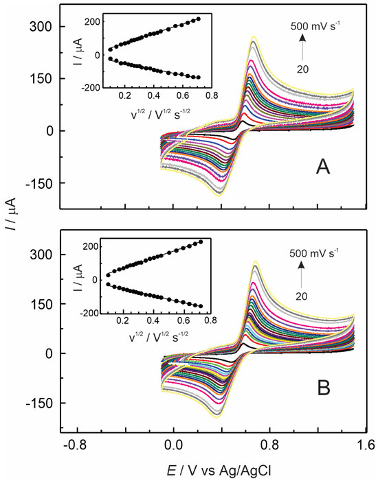 The effect of scan rate on adrenaline oxidation was studied by cyclic voltammetry using a Nafion–TMS modified GC electrode at a concentration of 2 × 10−4 mol L−1 AD in 0.1 M H2SO4. As shown in Figure 5, both the anodic and cathodic peak currents rise linearly with square root of the scan rate (v1/2), indicating that diffusion is the dominant transport mechanism through the layer. By applying the Randles–Sevcik equation (Equation (1)) [38] and analyzing the slope of the inset shown in Figure 5, the diffusion coefficient was calculated to be 7.9 (± 0.5) × 10−5 cm2 s−1, as reported in Table 1.