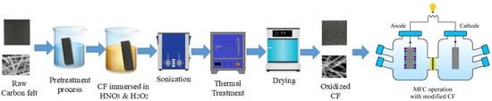 Researchers have initiated efforts to introduce impactful modifications in anode materials. Carbon materials used as electrodes possess certain inherent drawbacks, including a limited presence of oxygen-containing functional groups on their surfaces and insufficient accessible surface area. These factors lead to the electrodes having less than optimal physical and electrochemical properties [10]. In one investigation, the effectiveness of various oxidative surface treatments—namely acid, electrochemical, and thermal—was examined for their role in activating carbon surfaces. The study authors concluded that carbon fibers treated with acid oxidation exhibited superior performance, primarily due to their enhanced interfacial adhesion properties [11]. One study examined the performance of dual-chamber microbial fuel cells utilizing carbon fiber (CF) anode surfaces treated with nitric acid (CF-HNO3) for the inclusion of oxidative functional groups. The modified anodes demonstrated superior performance compared to bare electrodes. Specifically, CF-HNO3 modification resulted in a 2.88-fold increase in maximum power density, achieving 193 mW/m2, in contrast with the bare electrode anode, which exhibited a power density of 67 mW/m2 [12]. A study examining the process of the electrochemical activation of commercial carbon cloth was performed using various acidic solutions, specifically 0.1 M H2SO4, 0.1 M HCl, and 0.1 M HNO3. Results from electrochemical experiments indicated that the carbon cloth treated with these acids achieved a notably higher peak current than the untreated carbon cloth [13]. In a recent investigation, a novel high-performance anode was synthesized, comprising tricobalt tetraoxide (Co3O4) combined with a Y molecular sieve (Co3O4/Y). The study examined the influence of the Co3O4 ratio and the effects of hydrofluoric acid (HF) modification on the performance of the Co3O4/Y composite. Remarkably, the H-Co3O4/Y-CC variant demonstrated superior power generation performance, achieving a maximum stabilized output voltage of 448 mV, a peak power density of 1179 mW/m2, and the lowest apparent internal resistance recorded at 466 Ω [14]. In addition, the inclusion of an ammonium group on the anode significantly enhances the power density and current density of the microbial fuel [15]. Modifying the anode electrode surface with acid, which is based on soil, coal, and other sediments (humic acid), and electrically depositing riboflavin, the microbial fuel cell (MFC) demonstrated outstanding electrocatalytic activity and reduced internal resistance [16]. An investigation was conducted to explore the impact of chitosan substrate and its nanometric form on the green energy yield of sediment microbial fuel cells (SMFCs). The researchers transformed chitosan microstructures into nanostructures and incorporated them as substrates in SMFCs. The findings demonstrated that SMFCs enhanced with nanochitosan achieved maximum power and current densities of 59.48 mW/m2 and 290.45 mA/m2, respectively [17]. Also, many researchers have aimed to enhance power generation from microbial fuel cells (MFCs) by incorporating conductive materials into the anode, such as nanomaterials [18,19,20,21]. While substantial advancements in MFC performance have been documented, the associated modification techniques require either sophisticated equipment or multi-step processes, coupled with prolonged treatment durations. These factors would inevitably escalate MFC production costs and hinder their widespread implementation [22]. Also, microbial fuel cell (MFC) performance is largely influenced by the substrate, which is vital for the metabolic functions of the microbes within the system. The majority of existing research has focused on the application of oxidative surface treatments using synthetic wastewater as the substrate, which is known to enhance microbial activity. Nonetheless, the exploration of oxidative surface treatment in combination with industrial wastewater remains insufficiently addressed in the literature.